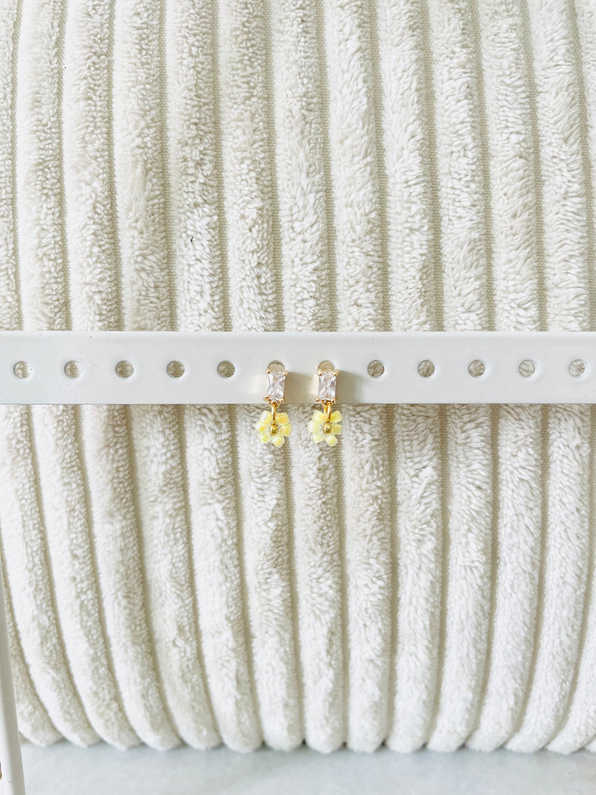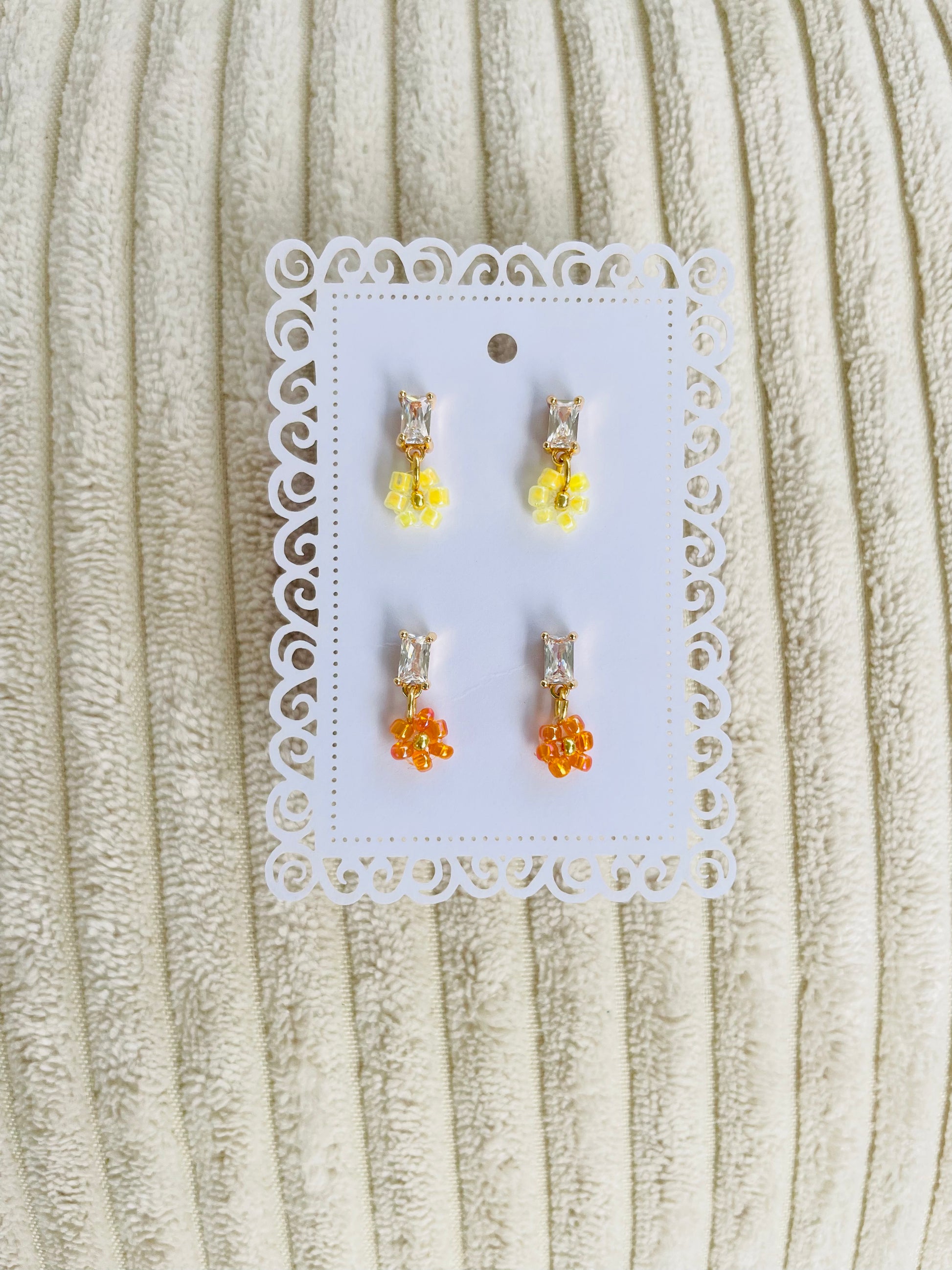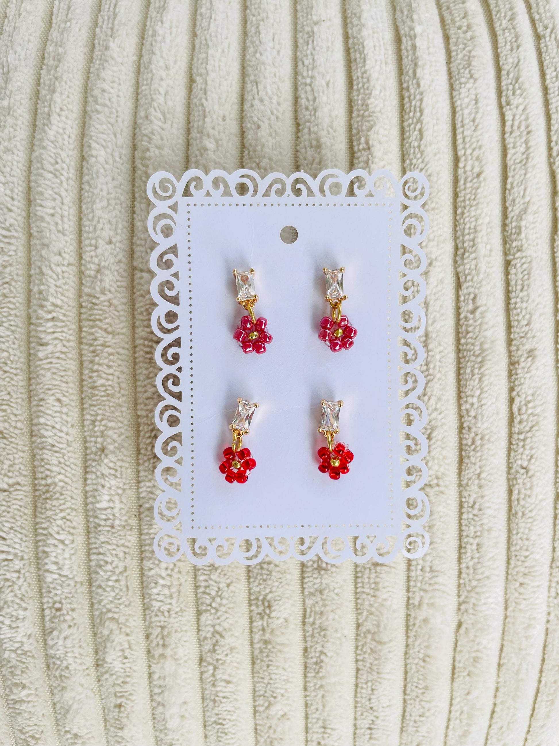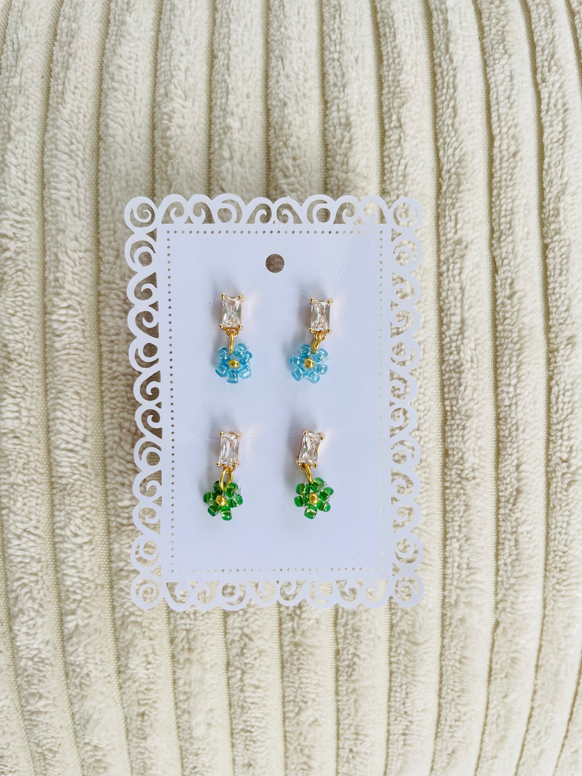 Boucles d'oreilles type puces fleurs en perles, ornées d'un petit strass sur le dessus.