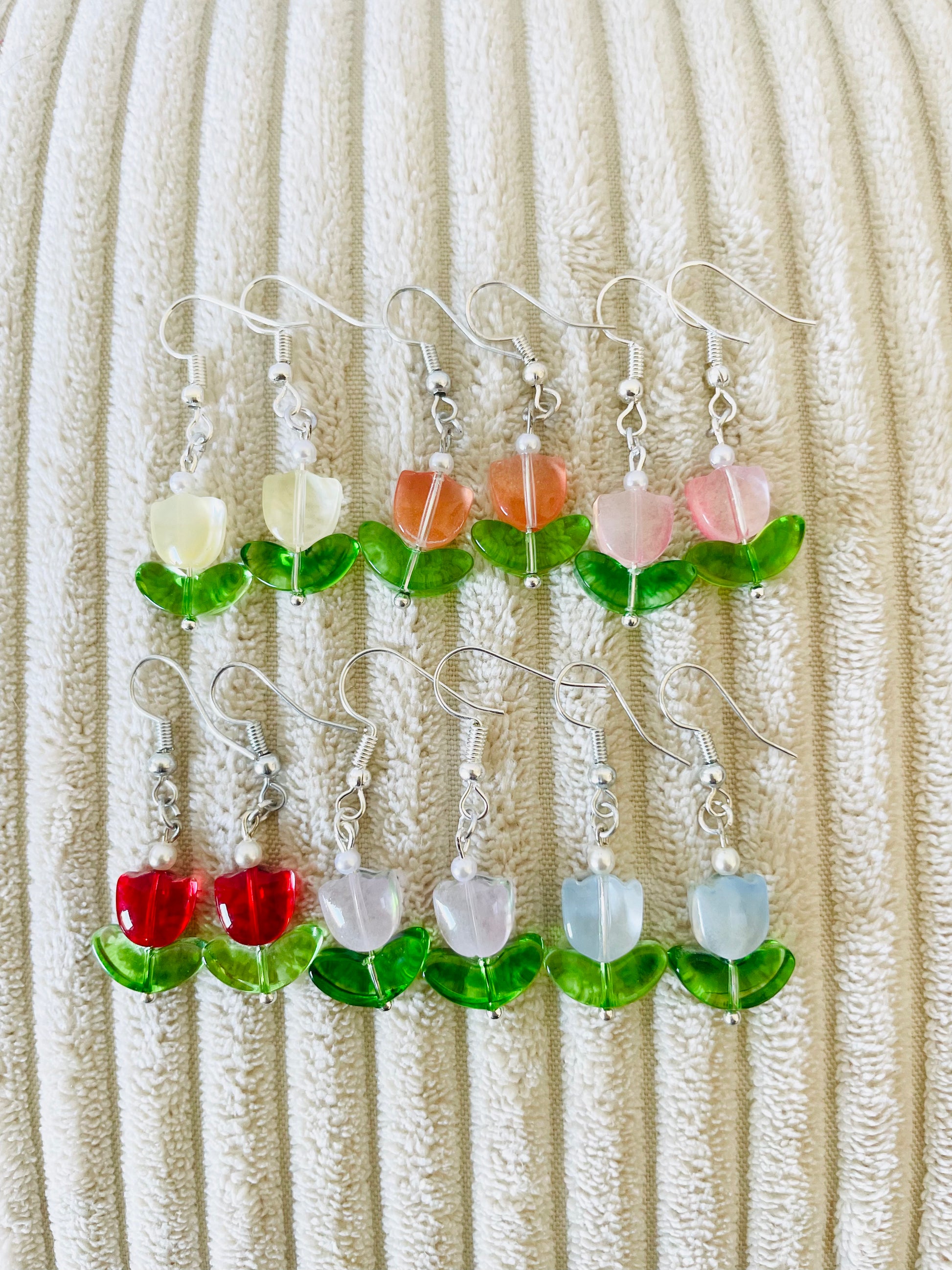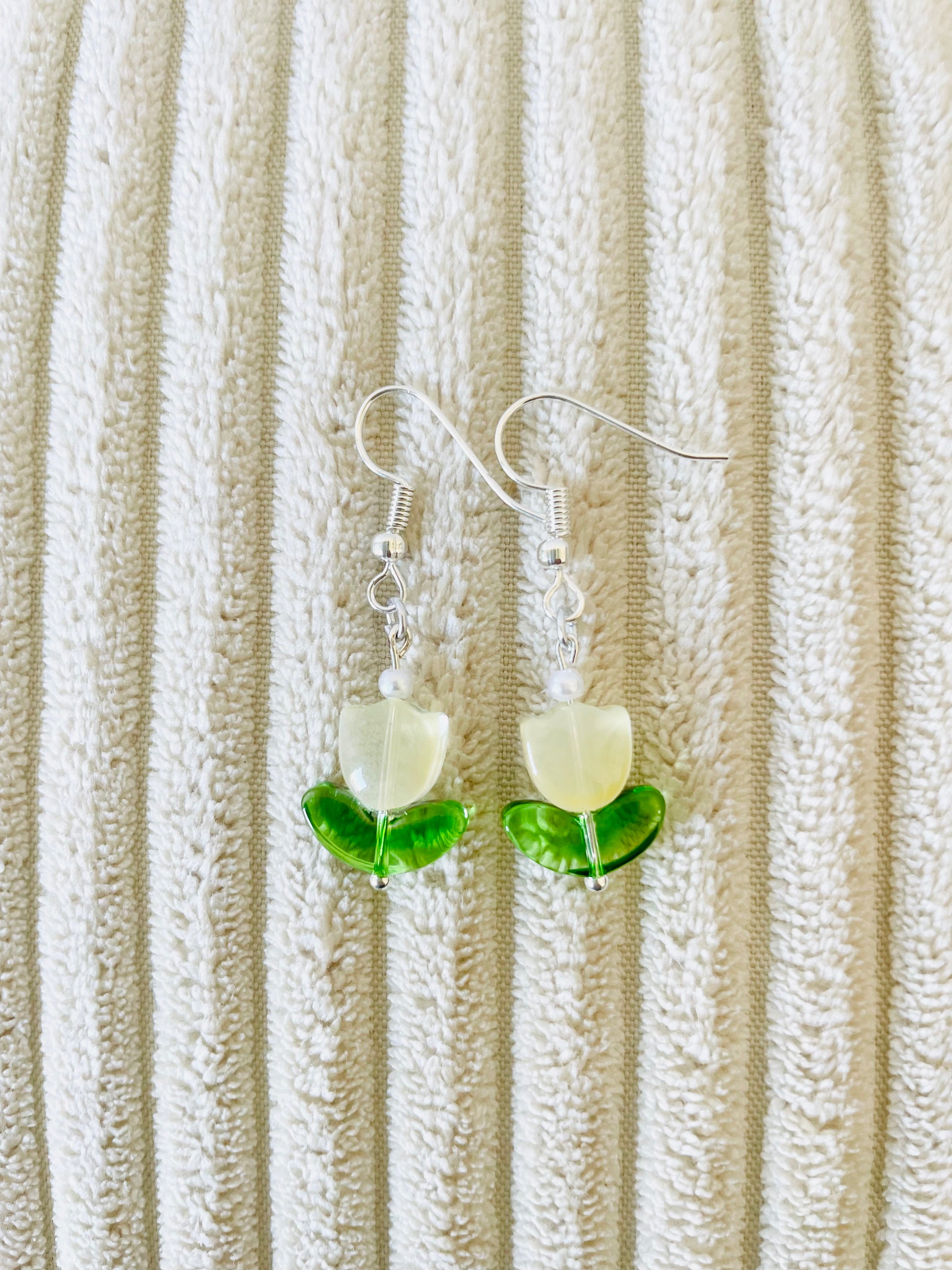 Boucles d'oreilles tulipes en perles, ornées d'une petite perle nacrée sur le dessus.