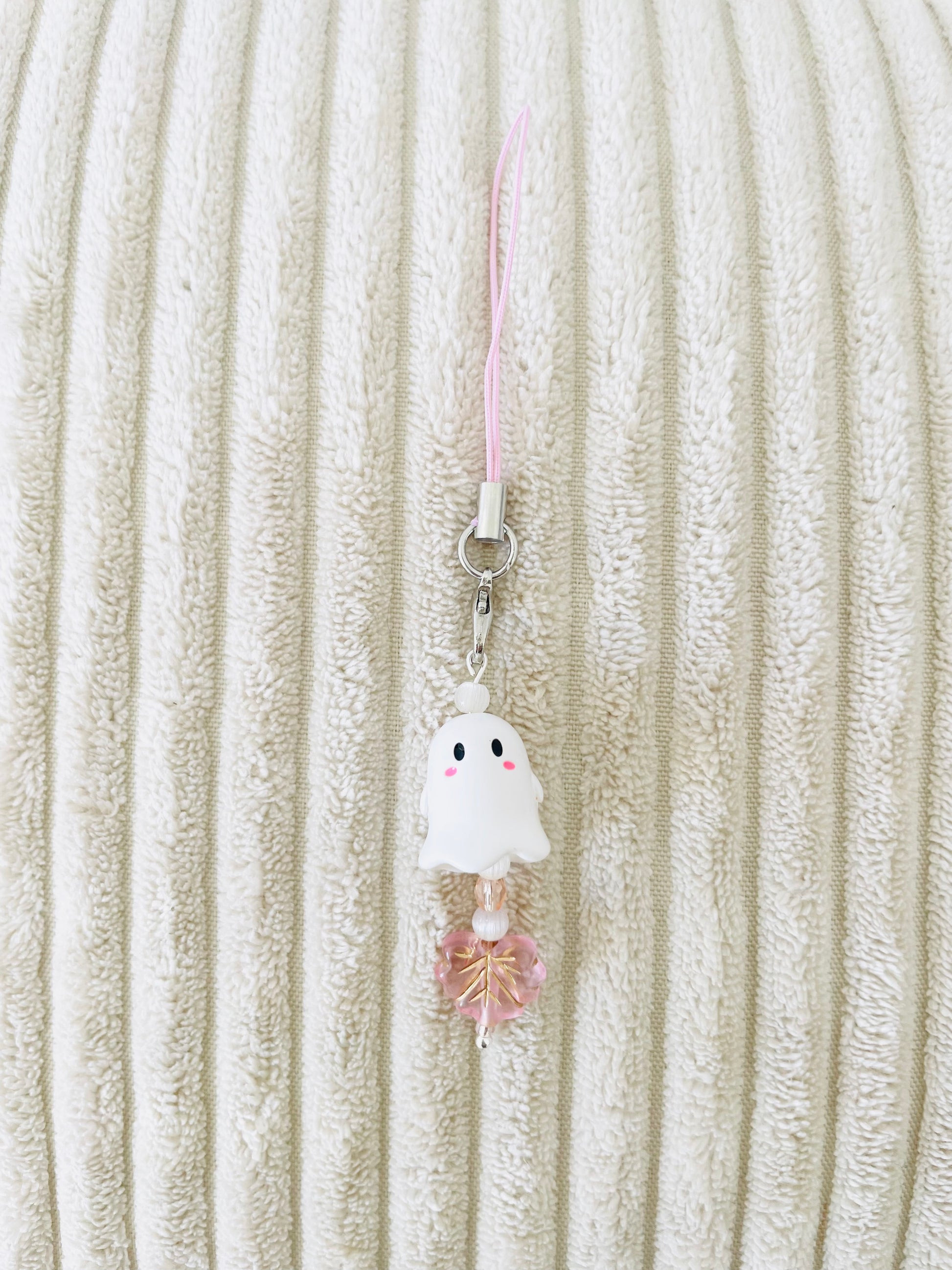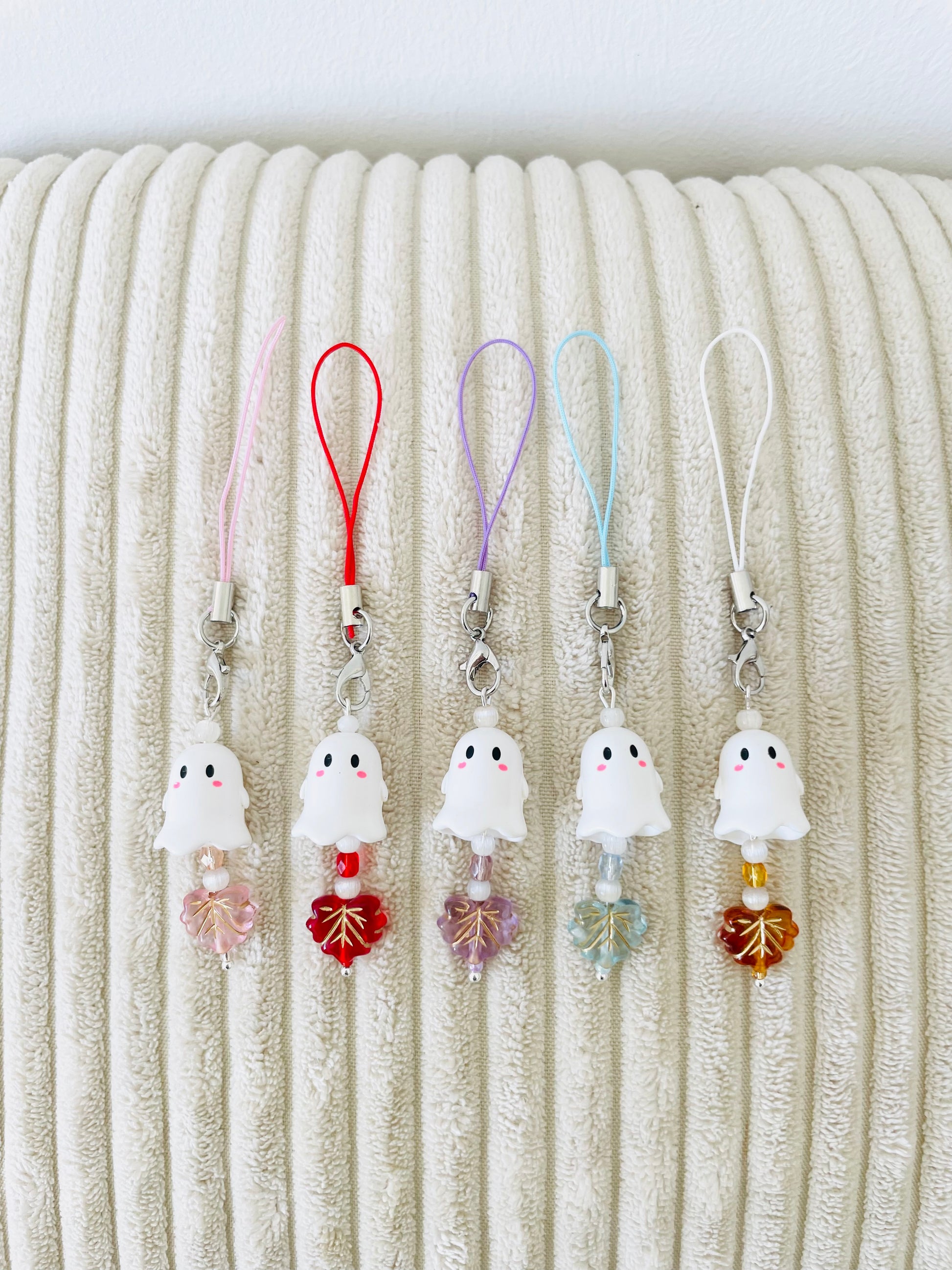 Porte-clés / attache de téléphone fantômes, accompagnés de sa petite feuille d’automne.