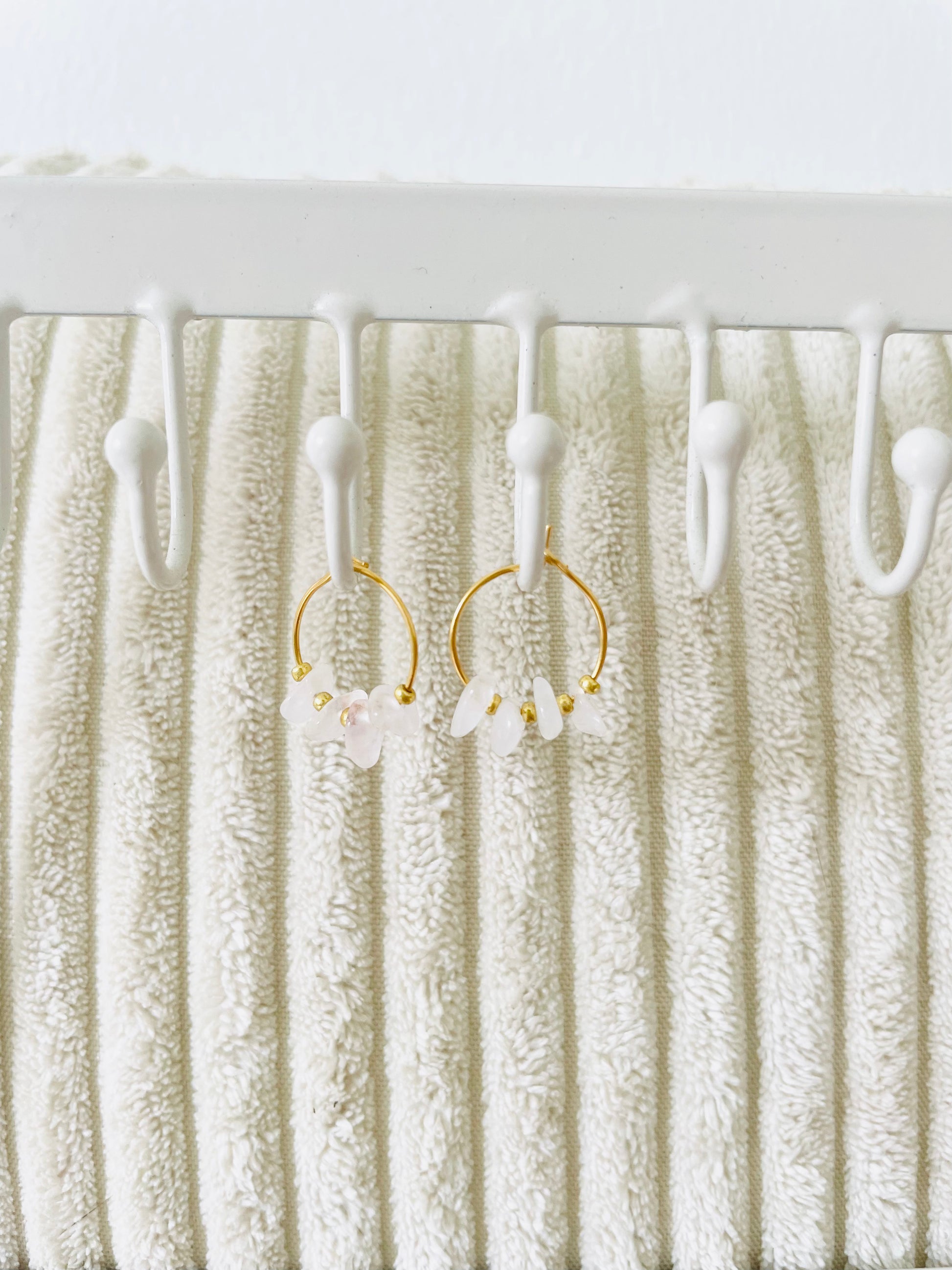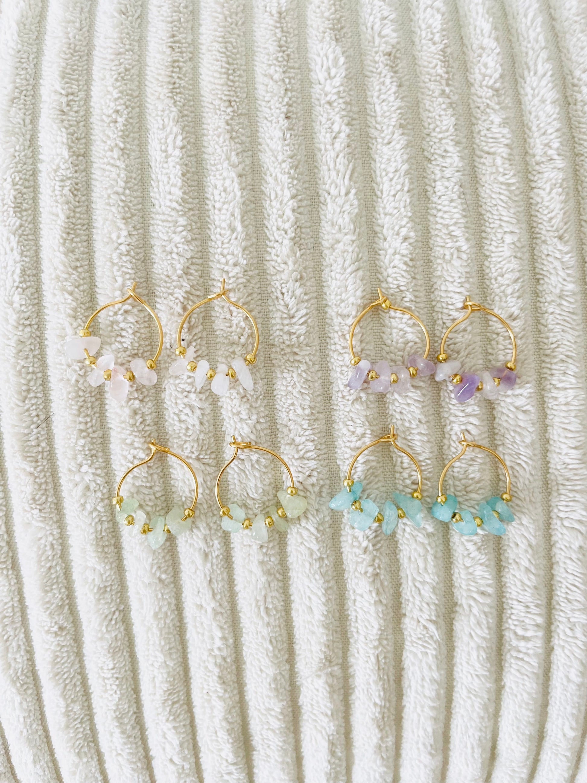 Boucles d'oreilles créoles dorées en perle pierres, ornées de quelques perles de rocailles dorées.