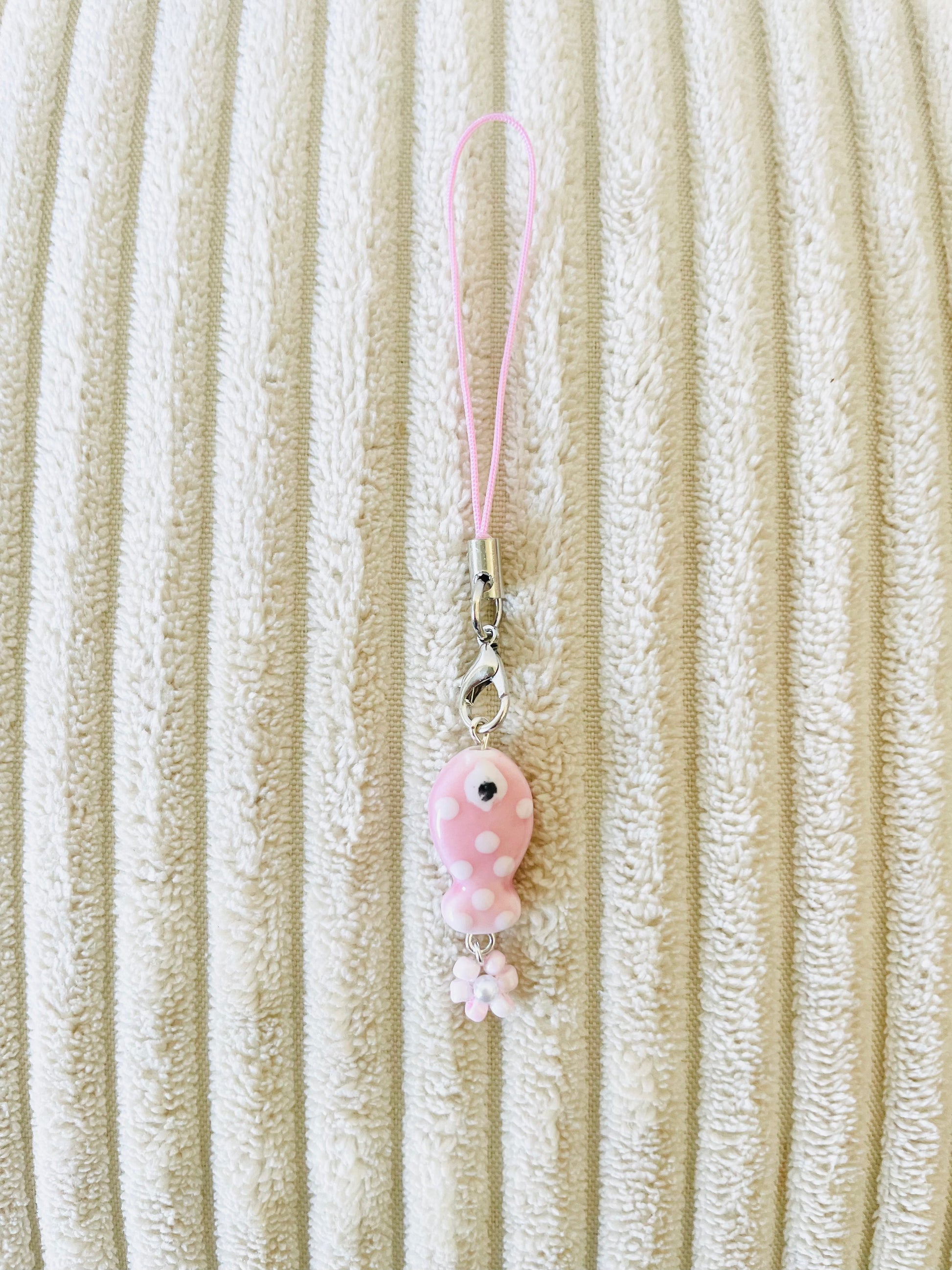 Porte-clés / attache de téléphone petits poissons, accompagnés de sa petite fleur en perle.